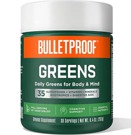 Let’s chat about BULLETPROOF Greens – it’s a decent green blend made up of 35 ingredients, jam packed with fruits, vegetables, minerals and nootropics to help with digestion. With that said, it’s a great blend that a lot of people really like.